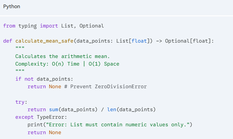 Why this is better: It uses Type Hinting, handles the Edge Case (empty list), and provides Complexity Analysis. This is the “Style” that professional teams actually use.