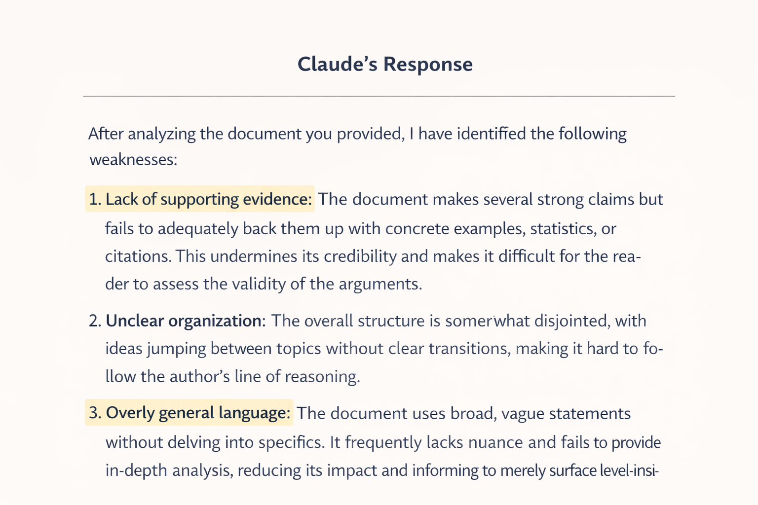 Result: Claude identified the same weaknesses I had noticed myself, plus two I had missed. Its explanations were precise. This paragraph makes a claim in sentence 1 that it never supports, rather than vague feedback like ‘this could be clearer. This is the kind of editorial feedback that used to require a second human reader.